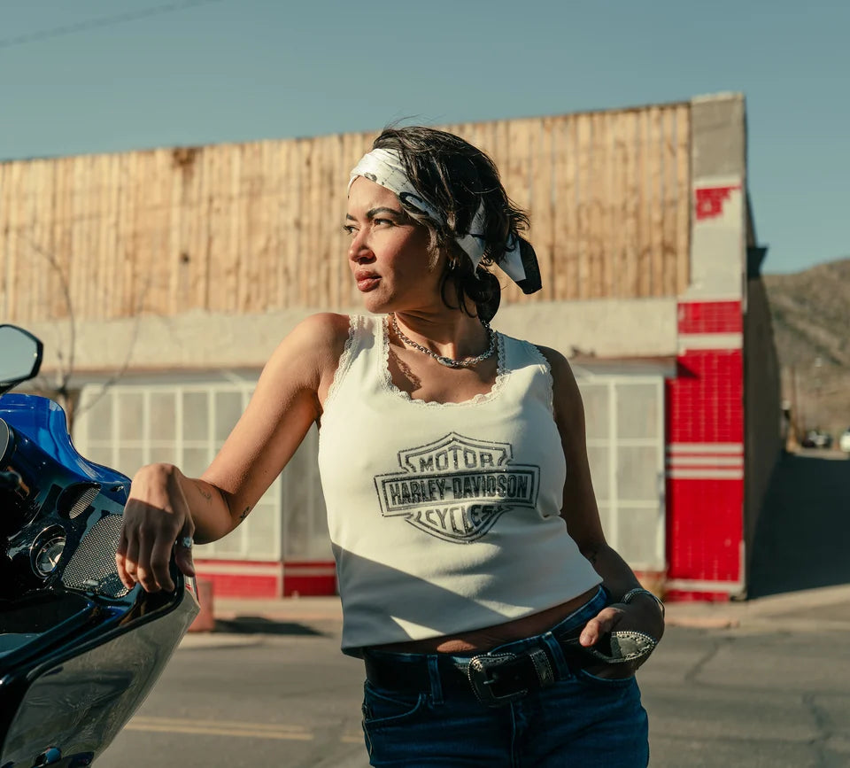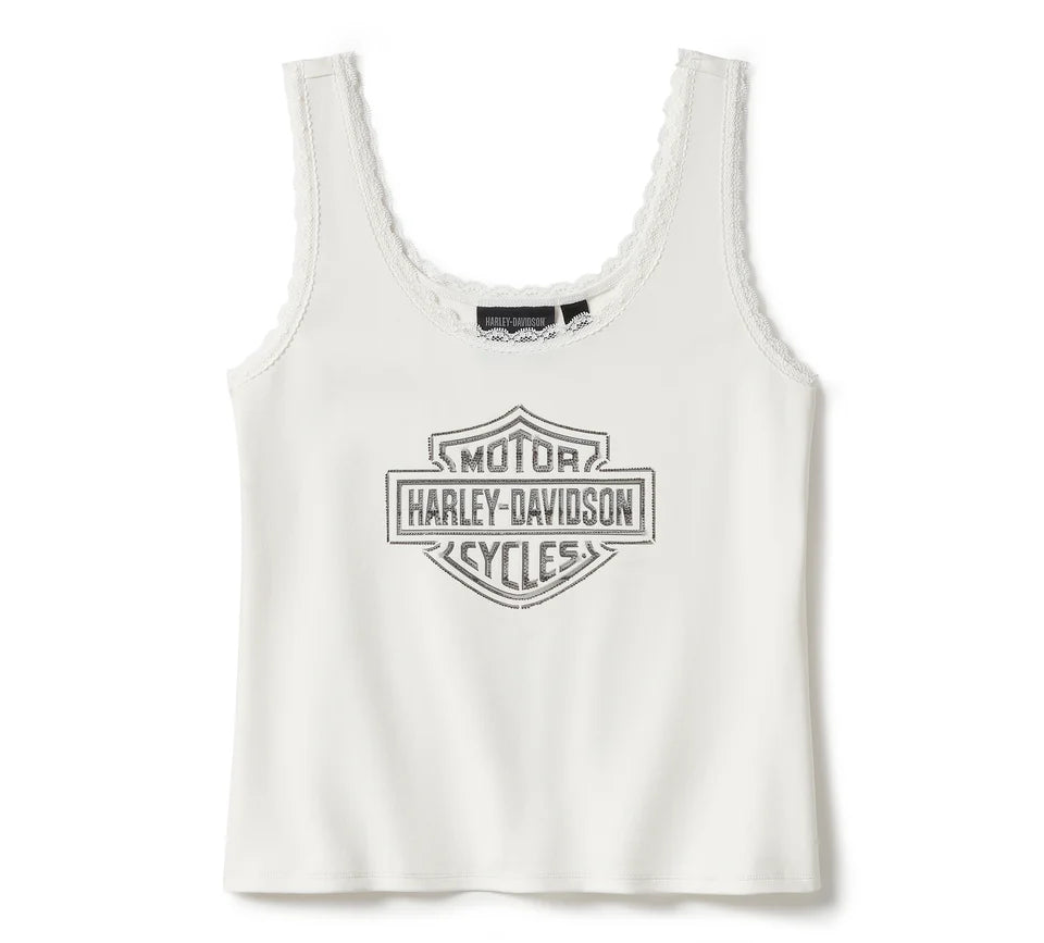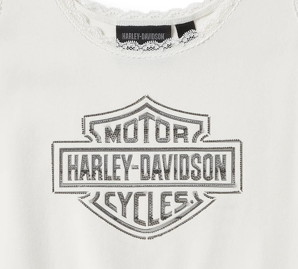Aggiungi un tocco di volant e brilla con la canotta Essential Bling. Realizzata in interlock di cotone con un tocco di spandex per una maggiore elasticità, è ideale da indossare a strati o da solo. La sua silhouette aderente presenta uno scollo rotondo davanti e dietro, finiture in pizzo e grafica H-D con decorazioni.