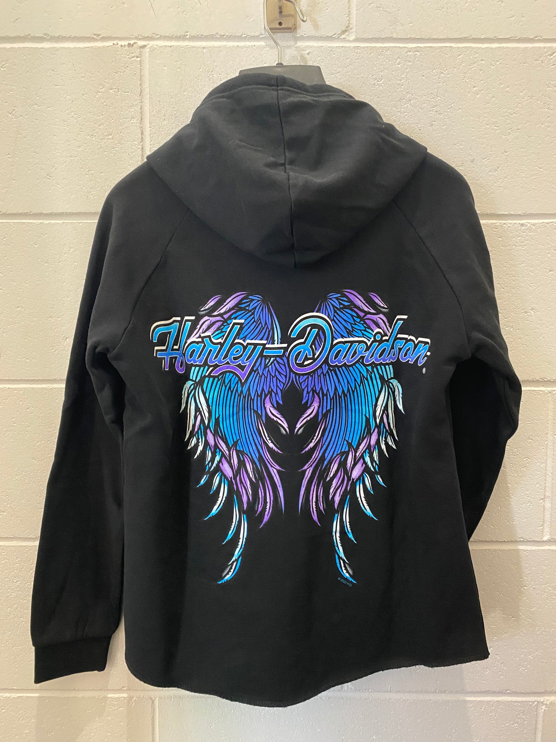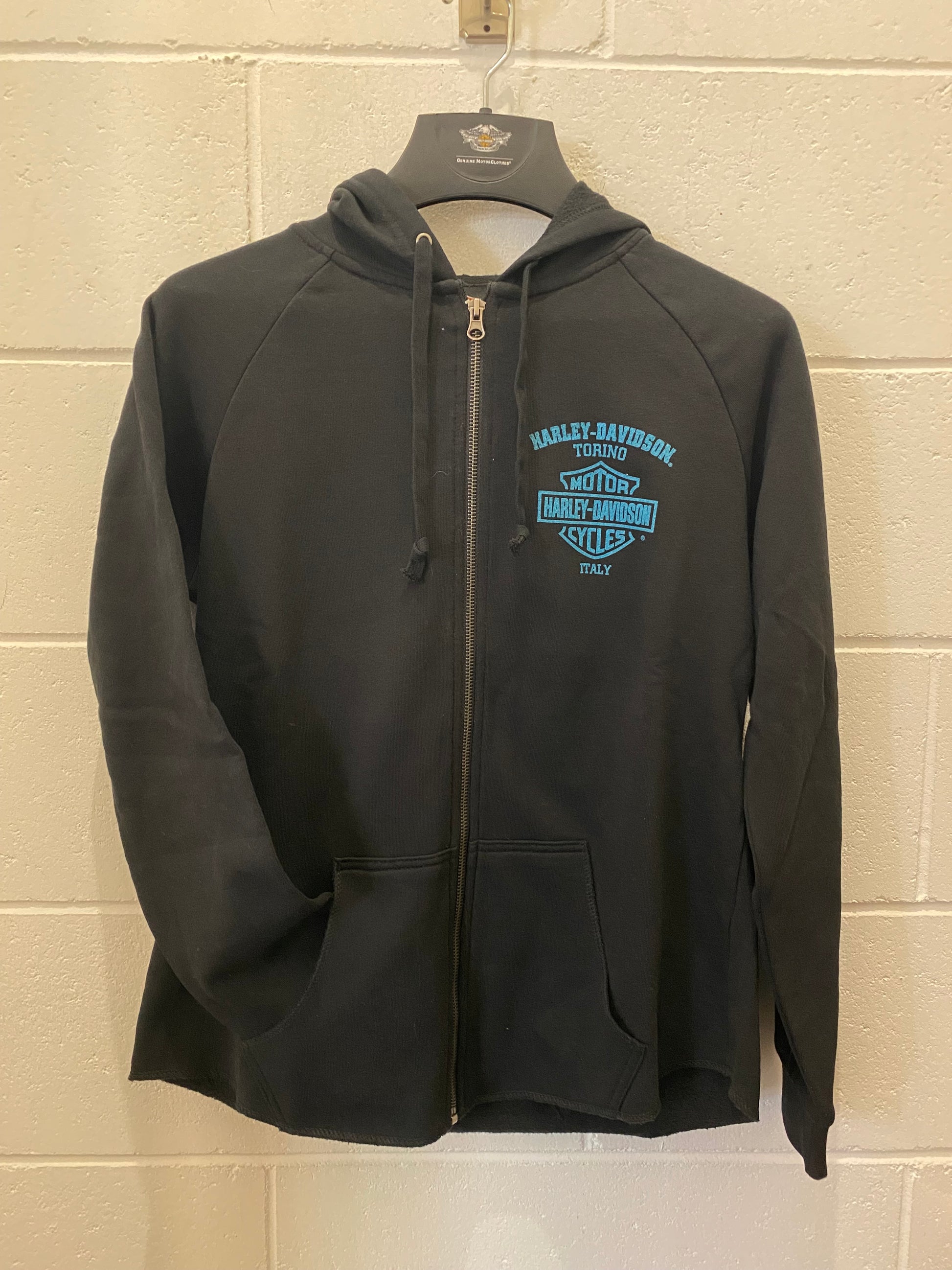 Felpa con cappuccio e zip Harley-Davidson® Dragon Wings da donna - Nero. Sul retro è dove avviene la magia. Splendida grafica alata serigrafata, luminosa e colorata. Sul davanti è presente il nostro logo Harley-Davidson® Torino.