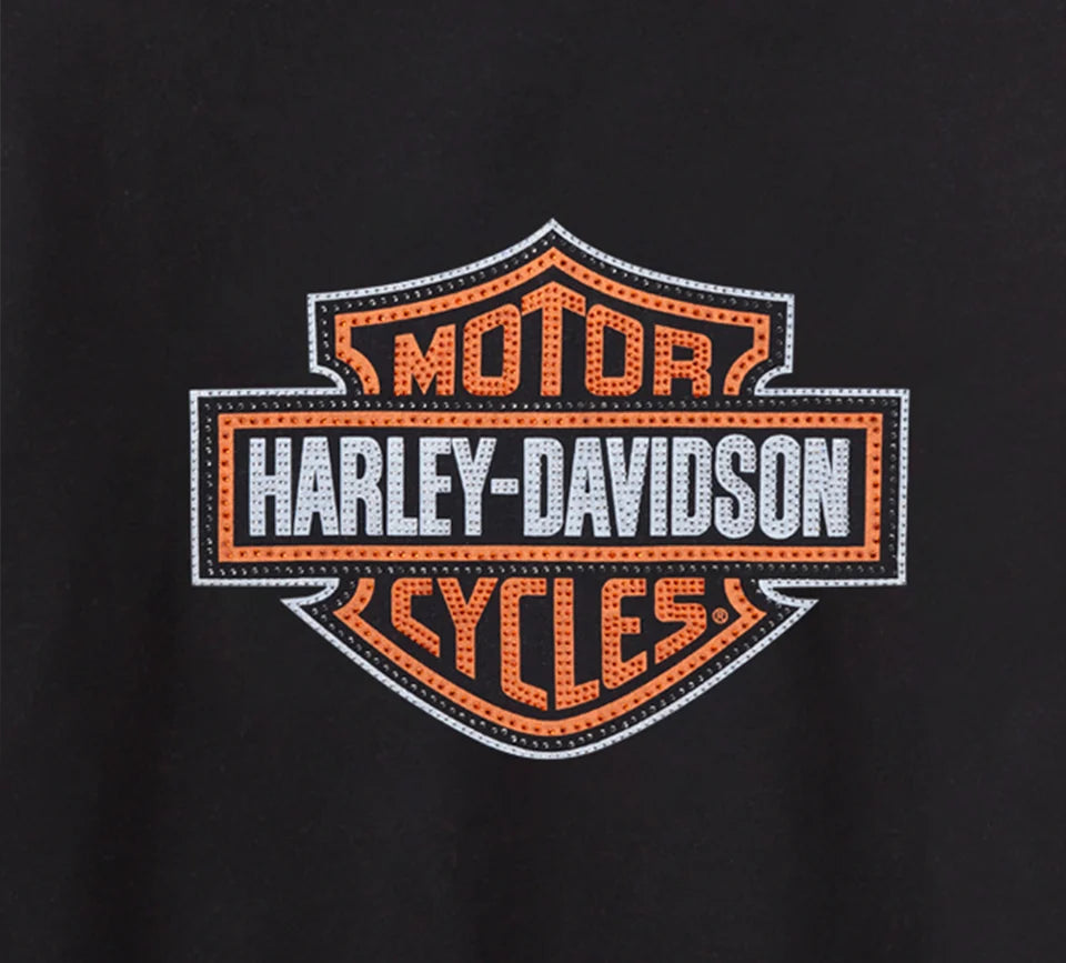 Aggiungi un po' di brillantezza al tuo classico look Harley con la nostra felpa con cappuccio Essential Bling Pullover. Realizzata in pile di cotone/poliestere la felpa si caratterizza per una vestibilità comoda e rilassata. Questa felpa con cappuccio è vivacemente rifinita con una grafica impreziosita da strass su entrambi i lati.