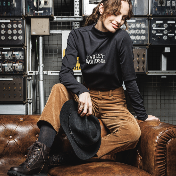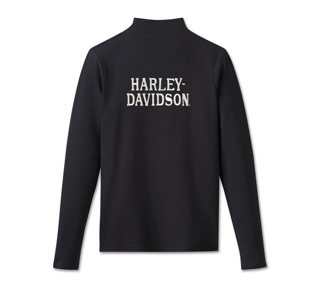 Maglia a collo alto con stampa Harley-Davidson® Superstar Milwaukee da donna - Nera. Realizzata in interlock pesante 97% cotone e 3% spandex. Silhouette aderente. Stampa personalizzata al centro. Collo a imbuto con risvolto.